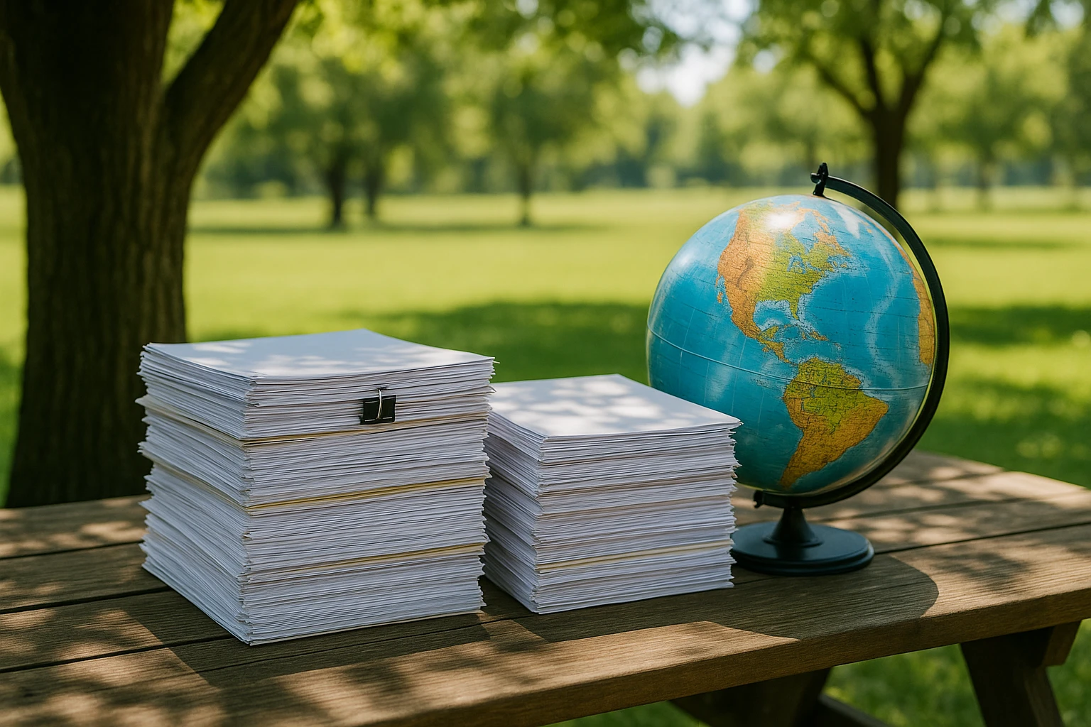Stacks of neatly organized financial documents beside a globe on an outdoor picnic table, under the shade of a tree, symbolizing the global reach and freedom gained from outsourcing bookkeeping tasks.