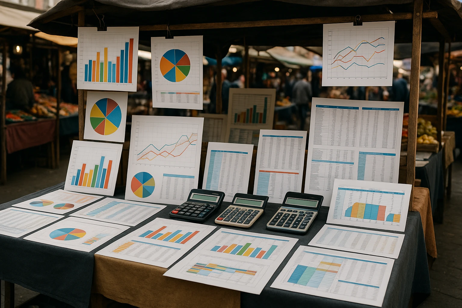A busy marketplace stall filled with colorful charts, balance sheets, and calculators displayed, capturing the idea of financial organization and diverse bookkeeping solutions available outside traditional office settings.